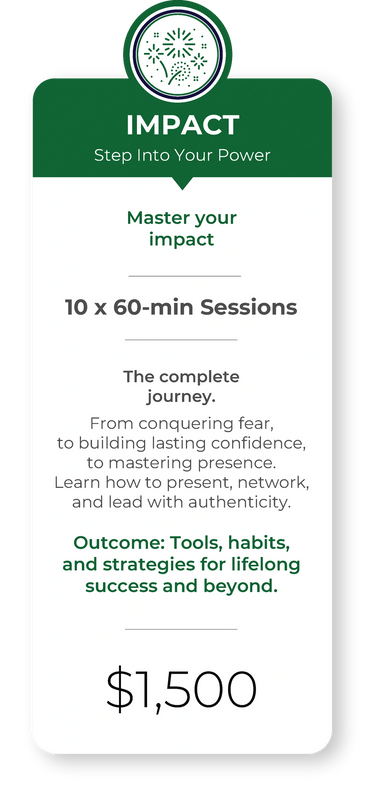 Build confidence, clarity, and presence in every conversation. Choose the package that fits your communication goals and growth path. All sessions conducted via Zoom or in-person.